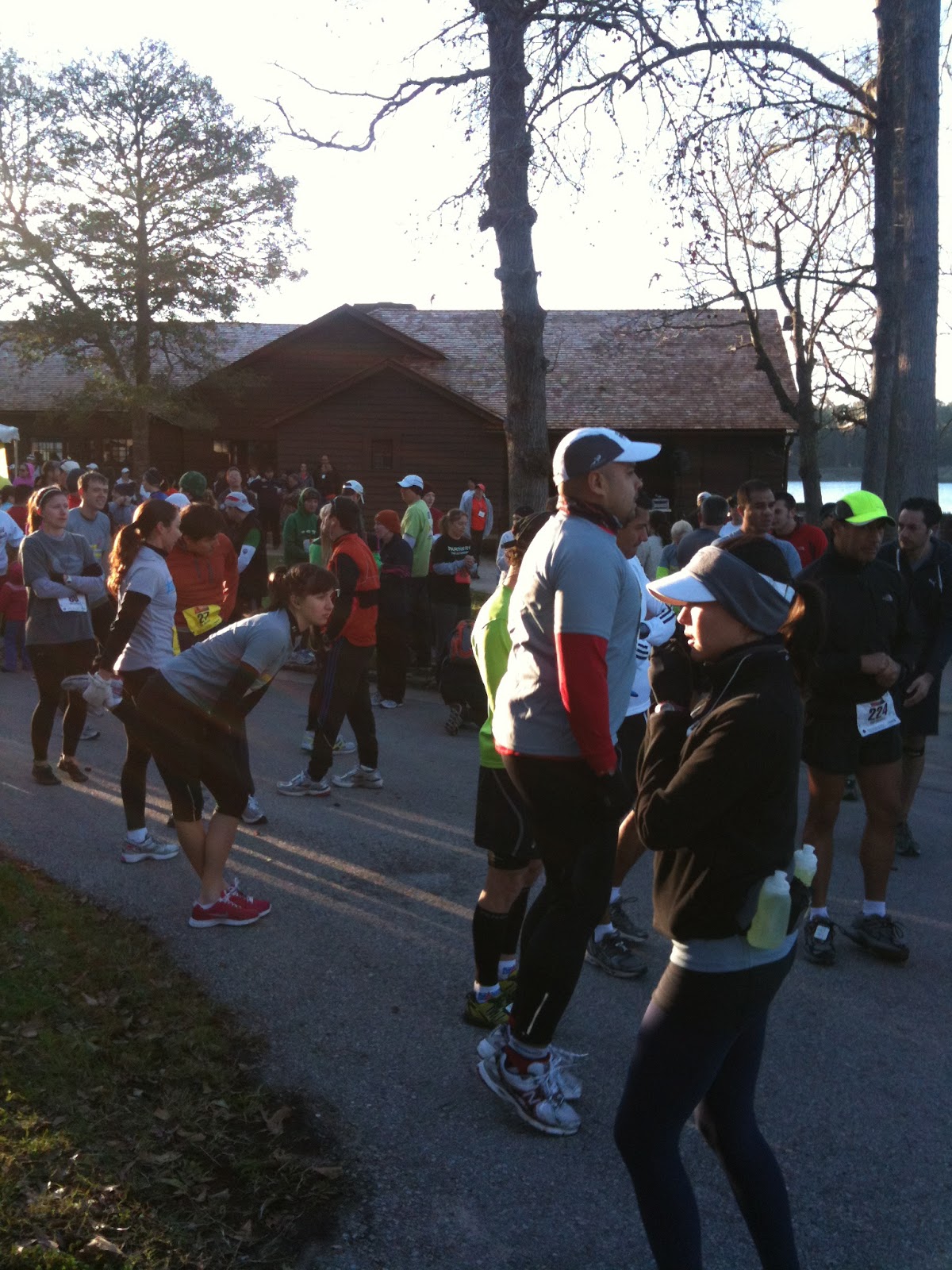 So off we go running through the woods for 13.1 - This race was very well put on. There were so many aid stations and volunteers. I think their were at least 4 aid stations on the route. I wasn't sure what to expect from this race since I hadn't really seen any marketing for it in the Dallas area, but we were told that 450 people had signed up, and after the beginning of the race crowd, I believe it. It was so awesome though. After the race we got our medals, and one of those delicious cupcakes that had been calling my name the whole race and a bbq dinner that was free for the runners! Seriously, does it get much better than that?
